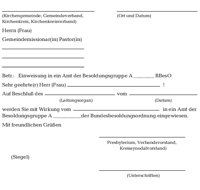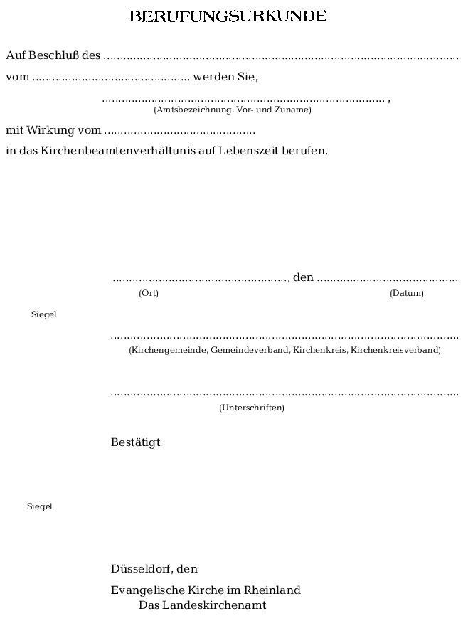 - Wird der Gemeindemissionar in das Kirchenbeamtenverhältnis auf Lebenszeit berufen, so ist ihm eine Berufungsurkunde nach dem Muster der Anlage 2 auszuhändigen. Wird er in ein Amt mit höheren Endgrundgehalt eingewiesen, so erhält er eine Einweisungsverfügung nach dem Muster der Anlage 3.